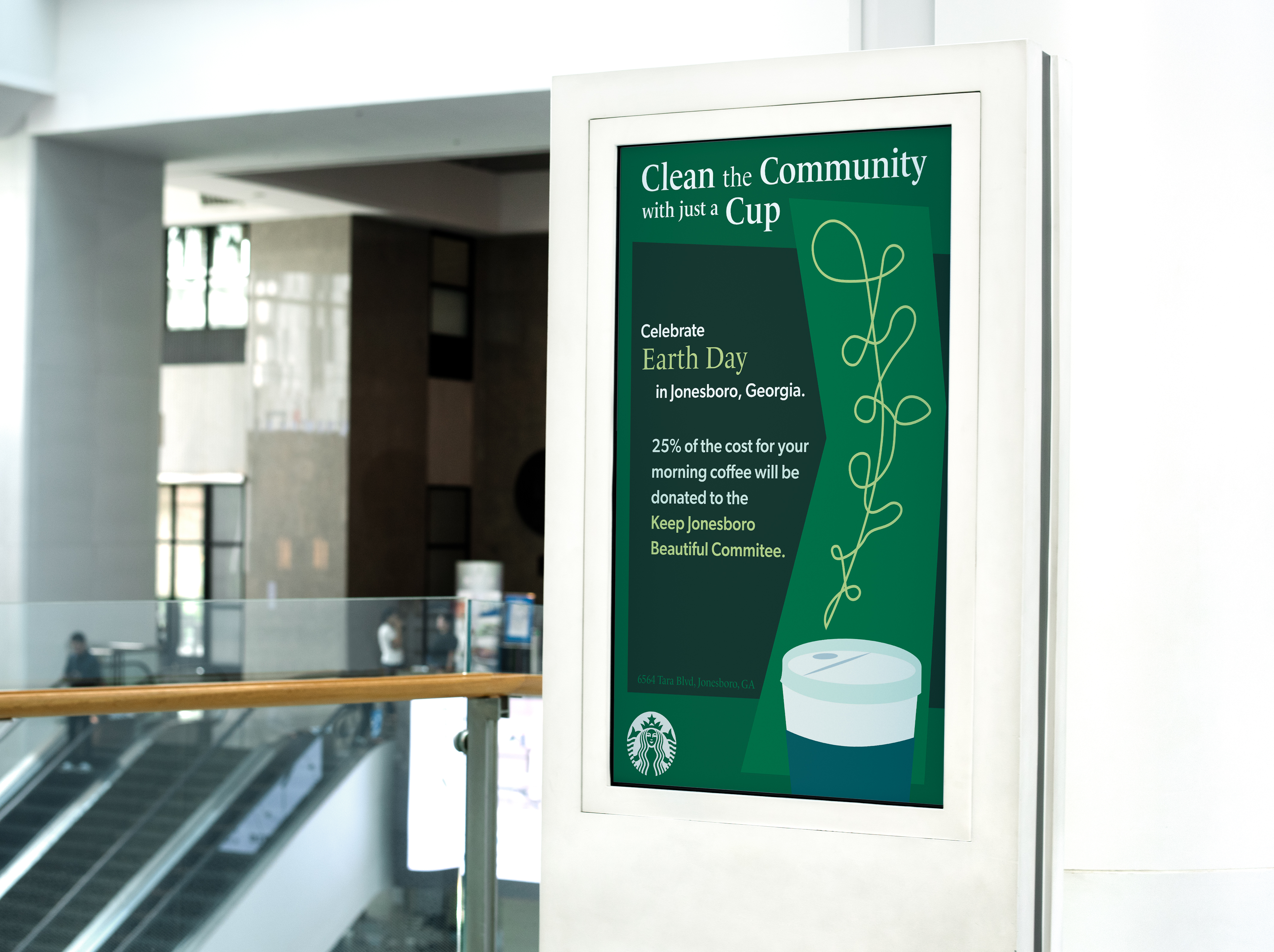 The goal of this project was to establish a holiday event for the Jonesboro, Georgia Starbucks location (known for community influence over other locations), the selection being Earth Day, and create a poster for the event. The purpose of the poster is to bring the Jonesboro community together to both enjoy coffee and help clean the community- a donatoin apart would go towards the Keep Jonesboro Beautiful Cleaning Committee to aid in community sustainabiity and encourage others to go green while enjoying Starbucks.