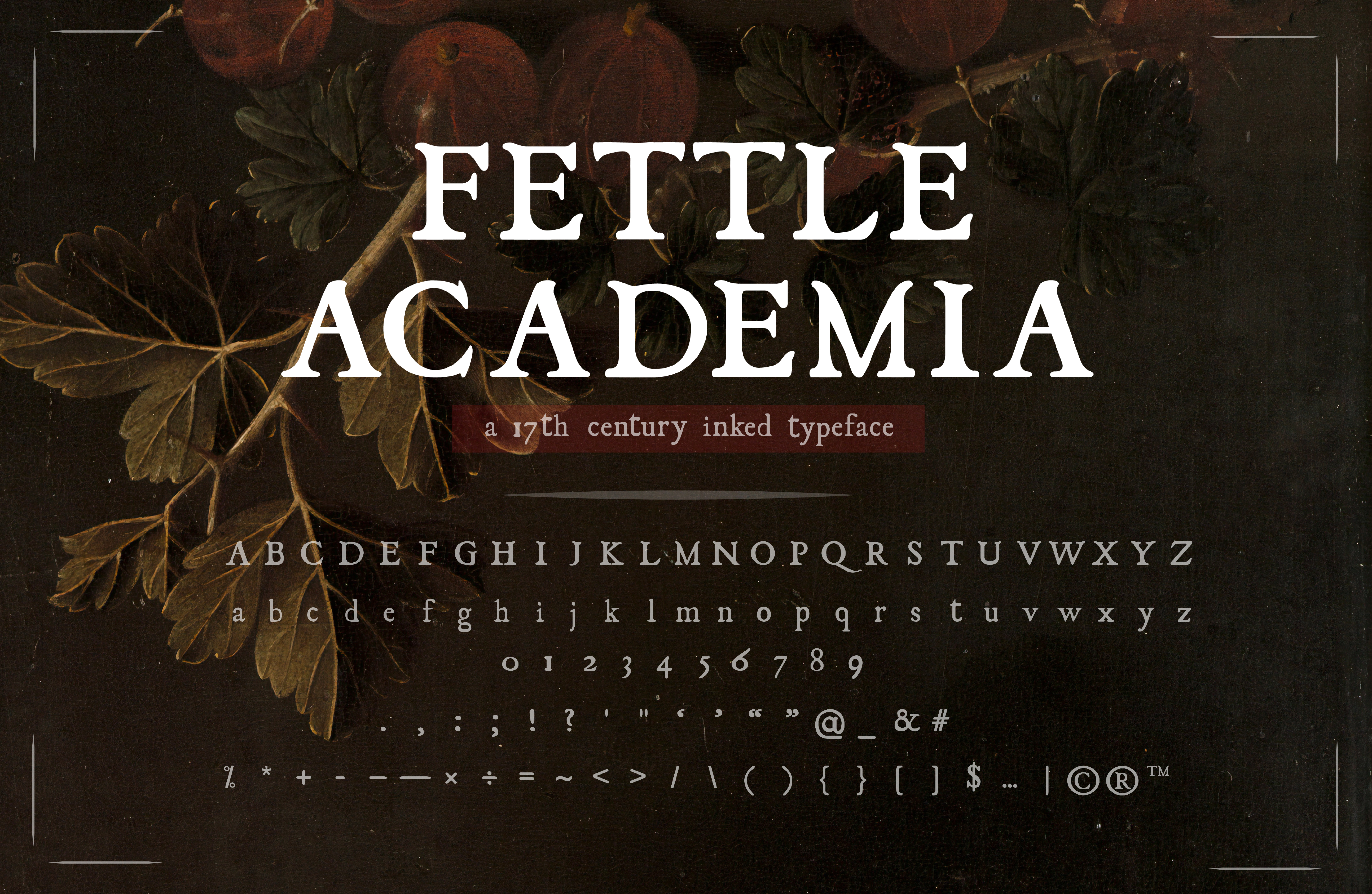 Fettle Academia is a font I recovered and revived from the original serif font JSL Ancient, a type-style font from the 1500s – 1600s that was typically used for display. The typeface was created by keeping the original structure of the JSL Ancient font family while modifying cleanliness (blotted and splotchy ink) and creating a cohesive unity amongst the typeface. The name “Fettle Academia” was chosen as “fettle” is a 16th/17th century term meaning, “to make ready; or, to clean up.”