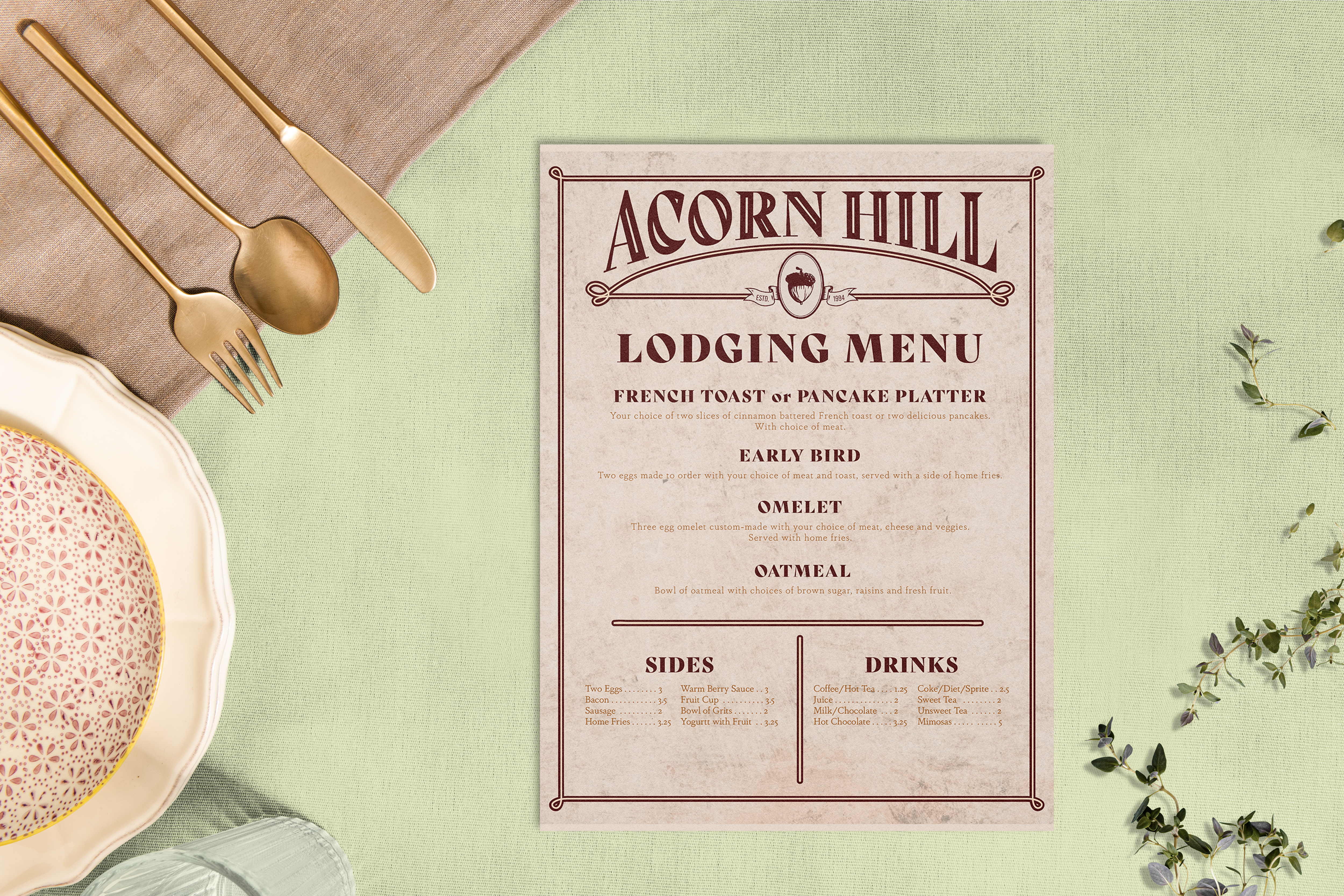 Acorn Hill is a combination lodge, spa and bistro located in Lynchburg, Virginia whose mission is to provide the perfect cozy-casual lodging experience with a touch of southern charm. This project was a redesign of an existing company- the goal was to make the branding cohesice with the company’s mission and aesthetics to unite their varying services. The company previously had three simple menu designs with little unity or cohesion between them. The previous menu layouts were transferred from white paper and varying alignments to a tea-stained paper with rustic fonts and a victorian style to match the company background.