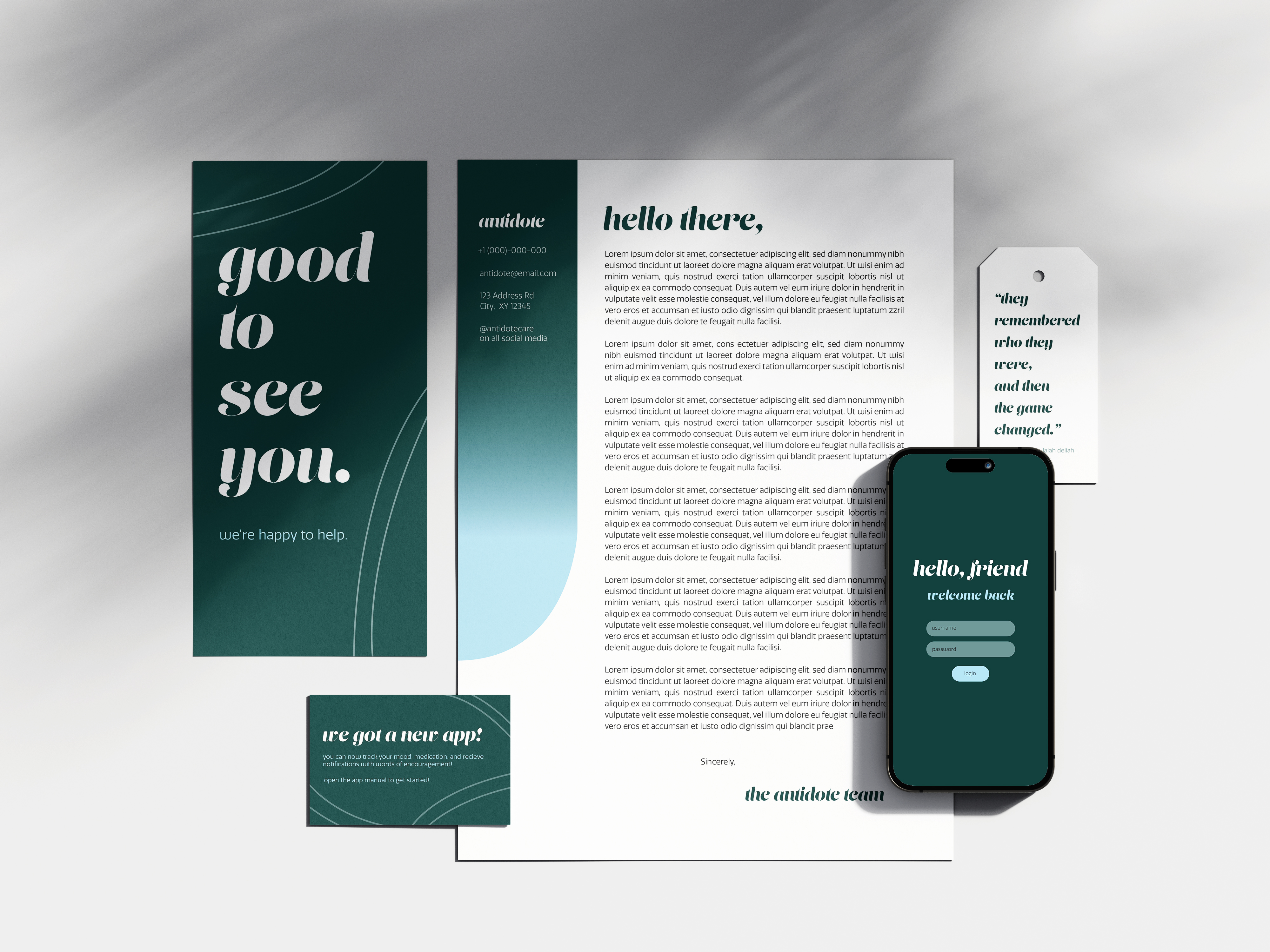 Antidote is a fictirious mental health subscription service that provides comfort products, therapy prompt journals, and mental health/medication trackers. Each box contains a personal letter, information on the company application, therapy prompt journals and care packages. This was a project I create for practice; the idea occurred as I was searching mental health subscruption boxes and noticed a common theme that most services were majorly catered towards women only. The goal of this passion project was to create a gender-neutral subscription service that anyone can use. I compiled a color palette with cool, calming tones and combined it with an approachable and minimalistic look.